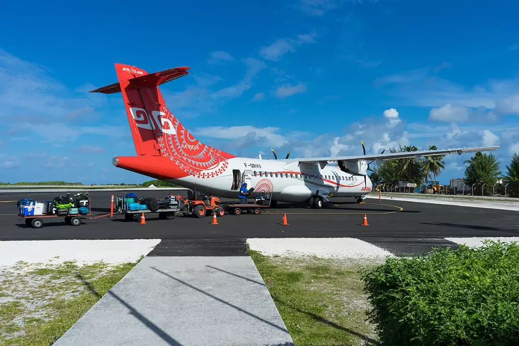 Chegando ao Tuamotu, esqueça as paisagens monumentais das ilhas Sous-le-Vent, o arquipélago da Sociedade. Diferentemente do Taiti, de Mo’orea, de Bora Bora, não há aquelas montanhas verdejantes em Rangiroa: os coqueiros são as coisas mais altas que você verá em todo o atol. E a uma hora de voo direto (a 350 quilômetros) de Pape’ete [PPTou de Bora Bora [BOB] — que para nós já é longe — com a Air Tahiti, a sensação de chegar a Rangiroa é a de se chegar ao meio do nada, com direito a detox digital compulsório: mesmo que você tenha comprado um chip de operadora local lá no Taiti, não existe acesso à internet pelo celular, e tampouco ache que o wi-fi do melhor hotel vai funcionar; é uma eternidade para subir uma mera fotinho no Instagram (isso se você estiver ao lado do roteador na recepção). No aeroporto minúsculo à beira mar, a pista de pousos e decolagens é invadida pela areia; não há esteiras de bagagens, que são entregues em mãos; o hotel recebe seus hóspedes com colares de flores Tiaré (flores de verdade e costuradas a mão); e a música está por todos os lados. Se não houver alguém de hotel ou empresa de transfer tocando ukulele, esse irmão mais simples e menor do violão, vai ter alguma família ou grupo de amigos tocando e cantando canções polinésias no aeroporto. (Ah, e chegue cedo ao aeroporto na hora de voltar; entre a fila e o processo todo manual, foi o check-in mais longo da minha vida). Imagens: foto do ATR-72 com capacidade para 68 passageiros no aeroporto de Rangiroa [RGI], Shoichi Iwashita.