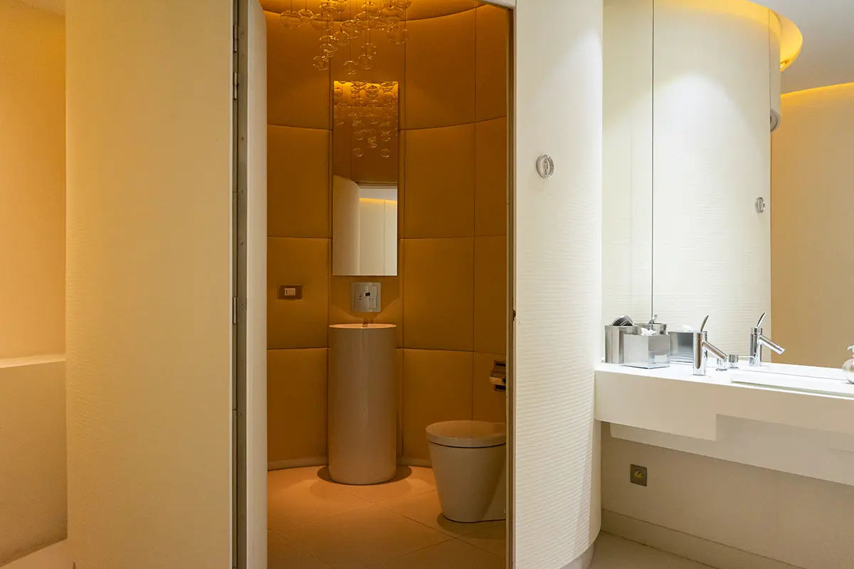 Apesar do conforto de uma sala espaçosa com 1.000 metros quadrados e pouquíssimas pessoas, o projeto de interiores do salon e a distribuição dos espaços não encantam, com exceção dos lindos banheiros em formato circular, e paredes forradas em couro creme. As poltronas e os sofás não são tão confortáveis (mas todas estão equipadas com saídas USB e USB-C); faltam mesinhas mais altas espalhadas pelo salão para acomodar bebidas e o computador (é preciso usar as mesas do restaurante para trabalhar); nas áreas de descanso, em vez de espreguiçadeiras nuas e cruas, por que não oferecer um enxoval completo trocado a cada passageiro com travesseiros e lençóis franceses incríveis para um descanso dos sonhos? Porque serviço de excelência não falta no salon La Première. Com funcionários vindos de grandes hotéis e restaurantes de Paris, a sala é administrada pela empresa de catering do grupo Alain Ducasse.