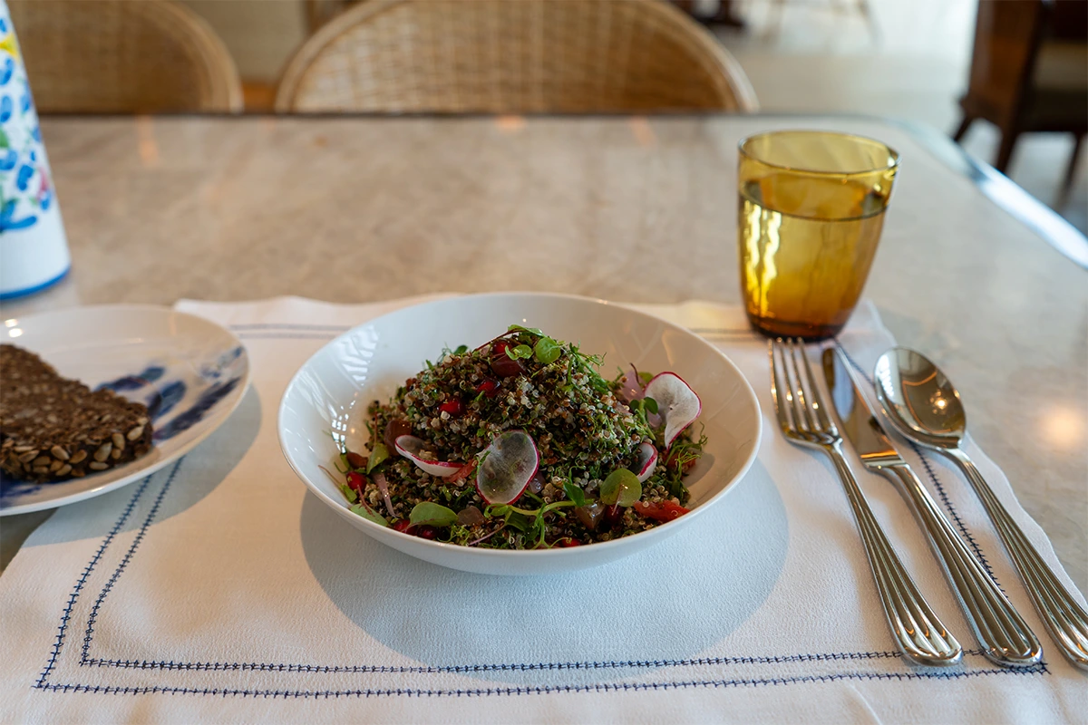 O que eu mais amo nos hotéis da Dorchetster são as opções saudáveis em todos os restaurantes e que tem um cardápio próprio no serviço de quarto, como essa deliciosa salada de quinoa com romã. Imagem: Shoichi Iwashita