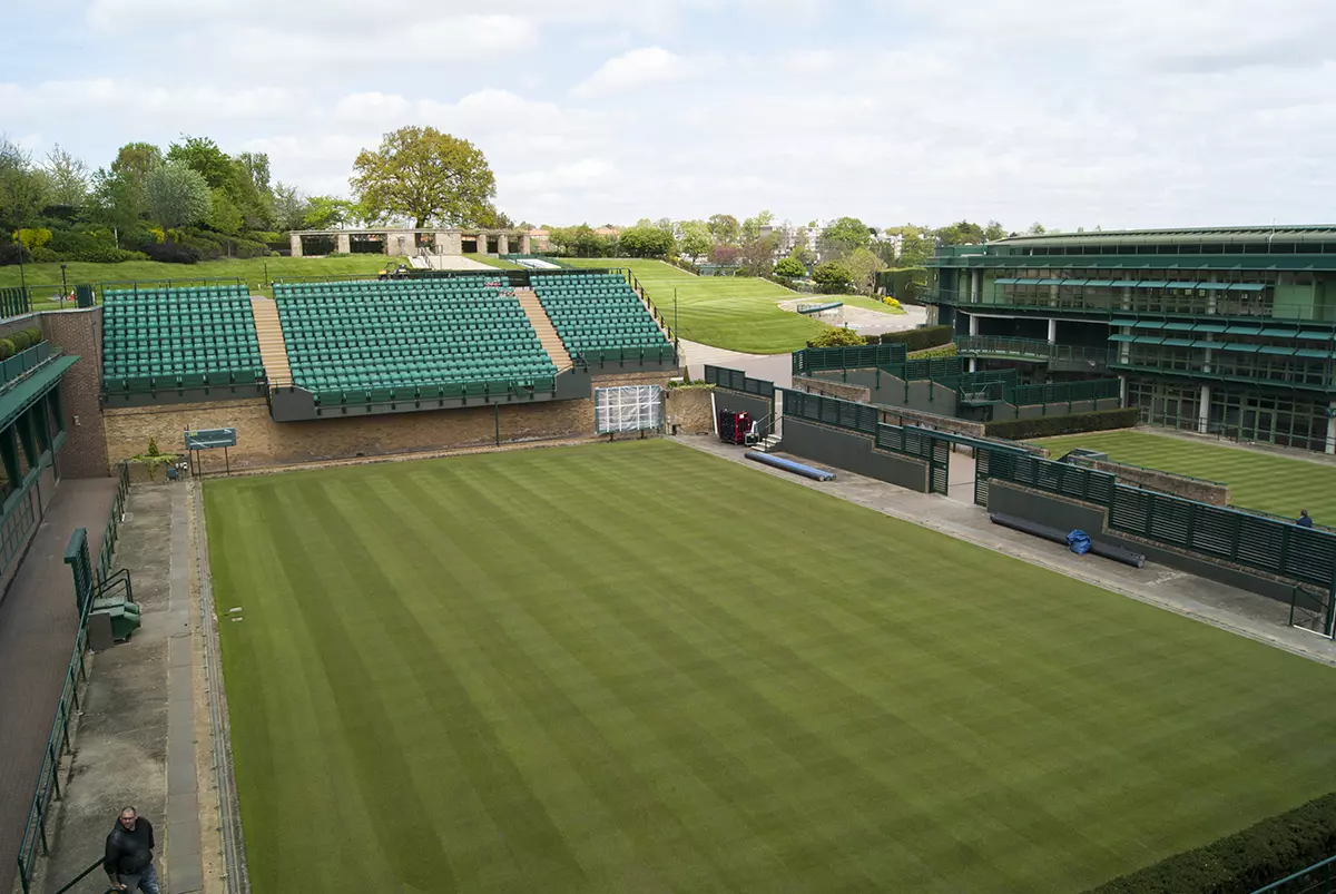 Mas não é uma grama qualquer — tipo aqueles tapetes verdes quadrados de grama que são replantados nos jardins. A grama sagrada, como é chamada por tenistas como Martina Navratilova, John McEnroe, Pete Sampras, Steffi Graf e Roger Federer, 100% Lolium perenne, é, em cada quadra, semeada (são 9 toneladas de sementes usadas a cada ano), germinada, cuidadosamente irrigada e cortada a uma altura de 8 milímetros. Grama tem o mesmo valor de ouro em Wimbledon.